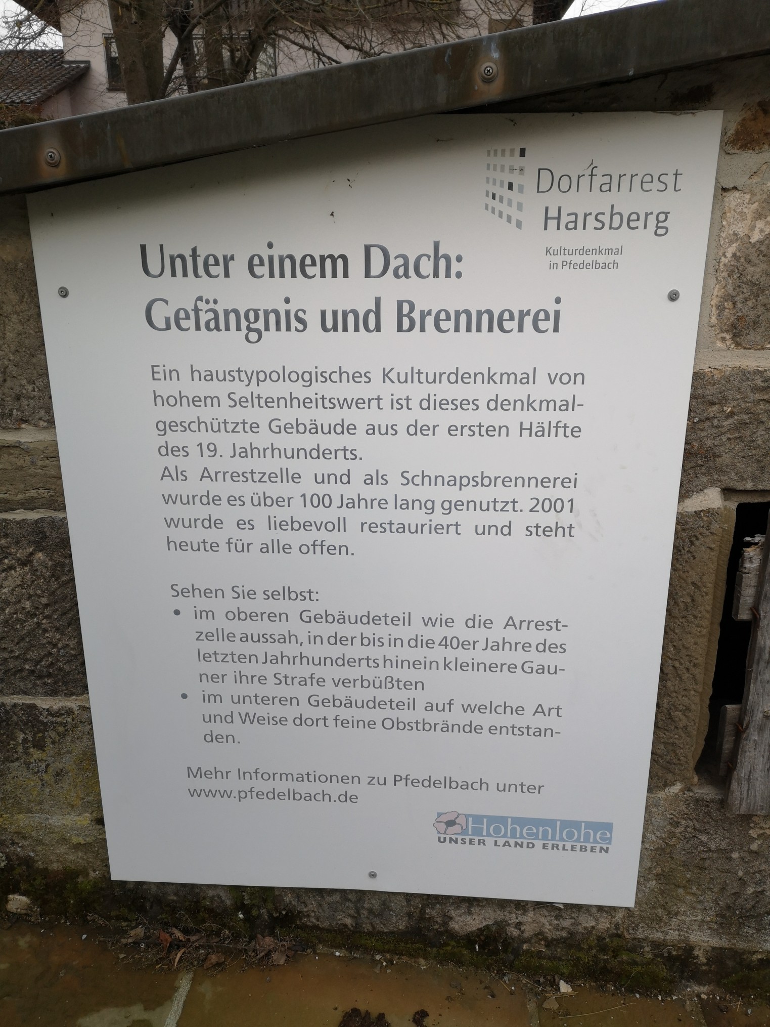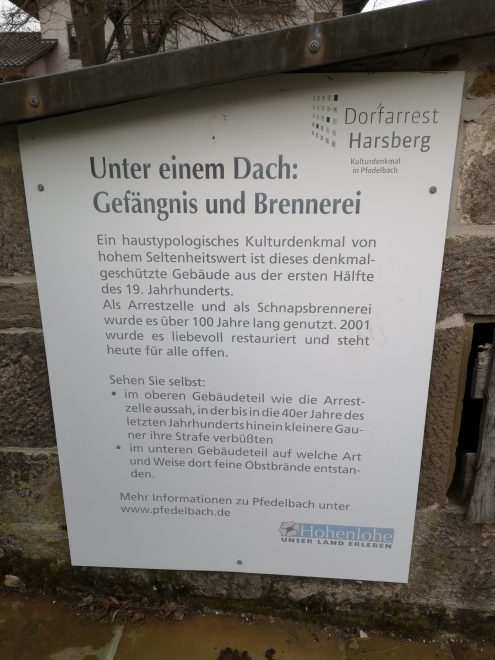 Nun wanderten wir auf dem aussichtsreichen Weg weiter Richtung Untersteinbach. Kurz vor Untersteinbach wechselten wir auf die andere Seite des Tals und spazierten gemütlich bis nach Harsberg. Wir bestaunten ein besonderes kleines Häuschen: Arrestzelle oben, Brennerei im Keller. Ein Multi-Funktionshaus aus Omas Zeiten!