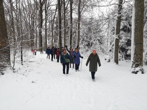 Pulverschnee und Minusgrade gleich sehr schöne Wanderung im Winterwunderland. Pünktlich zur Wanderung am Sonntag hatte es geschneit und so ein Wintermärchen wahr werden lassen. Los ging es vom Parkplatz bei den Wellingtonien in Wüstenrot. Von dort auf verschneitem Waldweg bis zum Raitelberg Resort, an diesem vorbei und über Schönblickstraße und Waldwegen nach Schmellenhof. Von Schmellenhof über den Fuhrweg hinunter nach Stangenbach. Ab hier wurde es etwas sportlich galt es doch den Anstieg hinauf zum Greuthof zu bewältigen. Oben angekommen ging es wieder in den verschneiten Wald, bis hinunter ins Joachimstal. Ab hier musste ein kleines Stück entlang der Straße über Altlautern bis zur Lohmühle gegangen werden. Ab der Lohmühle ging es dann wieder auf teilweise sehr schmalen Pfaden und etwas steil zwischen schneebedeckten Bäumen hinauf in Richtung Wellingtonien und zum Ausgangspunkt der Wanderung. Durch den Pulverschnee und der trockenen Kälte war es eine im wahrsten Sinn des Wortes sehr schöne Winterwanderung.