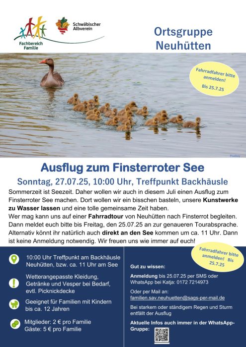 Familienausflug zum Finsterroter See So., 27.07.2025, Neuhütten Uhrzeit: 10:00 - 16:00 Ort: Marktplatz Neuhütten Öhringer Straße 1 71543 Neuhütten iCalendar Mit dem Laden der Karte akzeptieren Sie die Datenschutzerklärung von Google.Mehr erfahren Karte laden Google Maps immer entsperren zur Übersicht
