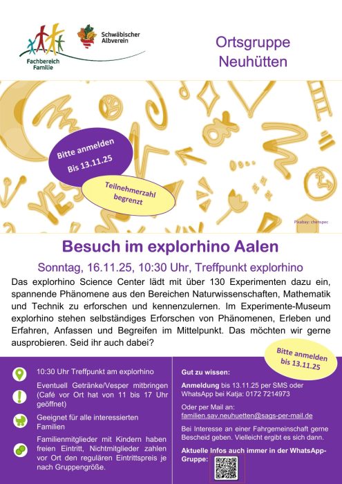Familiengruppe – Besuch im explorhino Aalen So., 16.11.2025, Uhrzeit: 10:30 - 16:00 iCalendar Mit dem Laden der Karte akzeptieren Sie die Datenschutzerklärung von Google.Mehr erfahren Karte laden Google Maps immer entsperren zur Übersicht